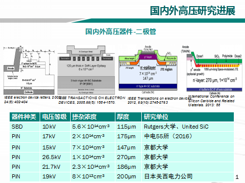 雖然在低壓領(lǐng)域SiC已經(jīng)進(jìn)入產(chǎn)業(yè)。但是在高壓領(lǐng)域,不管是國內(nèi)還是國外都還處于研發(fā)階段。由于材料的優(yōu)勢,國外的研發(fā)進(jìn)度要領(lǐng)先一些,日本京都大學(xué)在3年前就研發(fā)了26.5kV的PiN二極管,美國的Cree公司在也在3年前就研發(fā)了20.7kV的IGBT。國內(nèi)在引進(jìn)先進(jìn)的厚膜外延設(shè)備后,厚膜外延材料制備技術(shù)得到進(jìn)步,最近也在高壓器件方面做了一些成績,比如中電55所在2016年報(bào)道了17kV 的PiN二極管,在2018年報(bào)道了12kV 的IGBT,說明國內(nèi)材料在一步步進(jìn)度,器件的差距也和國外漸漸縮小。