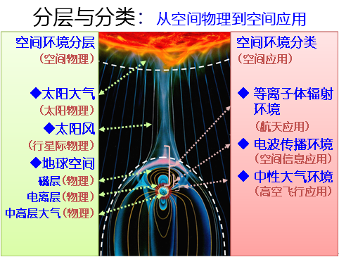 首先介紹日地空間的一些常識(shí)。在太陽(yáng)表面的部分稱作太陽(yáng)大氣,就是太陽(yáng)物理。在太陽(yáng)和地球之間,存在太陽(yáng)風(fēng),又稱作行星際物理。在距地球附近,稱作地球空間。地球空間又有磁層,在距地球1000公里以上,處于等離子體輻射環(huán)境,與航天應(yīng)用有關(guān)。在距地球60-1000公里之間,存在電離層,與空間信息應(yīng)用有關(guān),屬于電波傳播環(huán)境,在飛行物飛行期間,需要通訊、導(dǎo)航、定位等。在距地球30-100公里間,屬中高層大氣,又叫中性大氣環(huán)境,高空飛行物如導(dǎo)彈在這一層飛行。