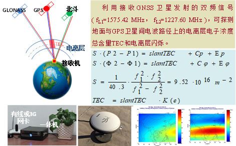 利用接受GNSS衛(wèi)星發(fā)射的雙頻信號(hào),可探測(cè)地面與GPS衛(wèi)星間電波路徑上的電離層電子濃度總含量TEC和電離層閃爍。