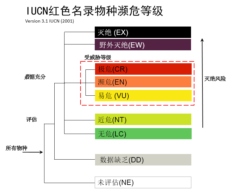 IUCN自20世紀60年代成立之日起,就設(shè)立了物種生存委員會(SSC),開始編制和印刷《IUCN瀕危物種紅皮書》,后來隨著評估物種的增加,印刷版逐步發(fā)展為網(wǎng)絡(luò)版的《IUCN瀕危物種紅色名錄》,定期編制發(fā)布。IUCN/SSC研究制定了《IUCN物種紅色名錄瀕危等級和標準》,根據(jù)物種的種群數(shù)量和分布情況等,評估其生存狀況,確定其瀕危等級。IUCN瀕危物種等級標準分為“有評估數(shù)據(jù)”和“數(shù)據(jù)缺乏”兩類,“有數(shù)據(jù)評估”中又分為“滅絕”、“野外滅絕”、“區(qū)域滅絕”、“極危”、“瀕?!?、“易危”、“近危”和“無?!钡?個級別,從“無?!钡健皹O?!?,滅絕風險逐步上升,瀕危等級逐步增加。瀕危等級標準有5個指標,分別是種群下降、有限地理分布區(qū)、下降小種群、非常小或非常有限的種群、以及模型模擬等量化分析,根據(jù)這些指標的數(shù)量閾值,來評估物種的瀕危等級。