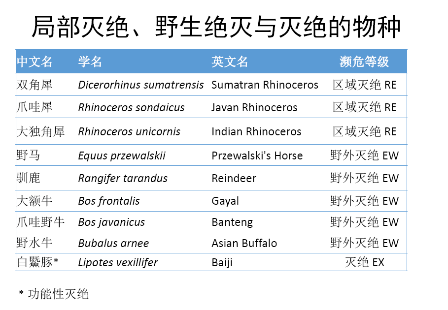 此外,我們對中國哺乳動物多樣性進行編目,分別于2015年和2017年完成了第一版和第二版,第一版中,我們收錄了673種哺乳動物,第二版中我們刪除了一些不存在的物種如倭巖羊,并增添了一些物種,主要是分布在藏南的一些物種,共收錄了693種哺乳動物,使得我國的哺乳動物總數(shù)位列全球首位。2015年發(fā)布《中國生物多樣性紅色名錄-脊椎動物卷》后,2018年又對該紅色名錄等級進行了更新,哺乳動物的情況來看,最新的評估結(jié)果中,受威脅的物種占26%、近危21%,無危40%,數(shù)據(jù)缺乏12%,其中有多個物種已經(jīng)區(qū)域滅絕、野外滅絕或功能性滅絕。部分中國特有的哺乳動物,中國生物多樣性紅色名錄和IUCN紅色名錄的評估結(jié)果,由于評估信息的不同,結(jié)果也有所不同,如白鱀豚、長江江豚等;還有一些哺乳動物由于并非中國特有,所以中國生物多樣性紅色名錄和IUCN紅色名錄評估等級有所不同,如野馬、賽加羚羊、麋鹿、蒙原羚、河貍等。