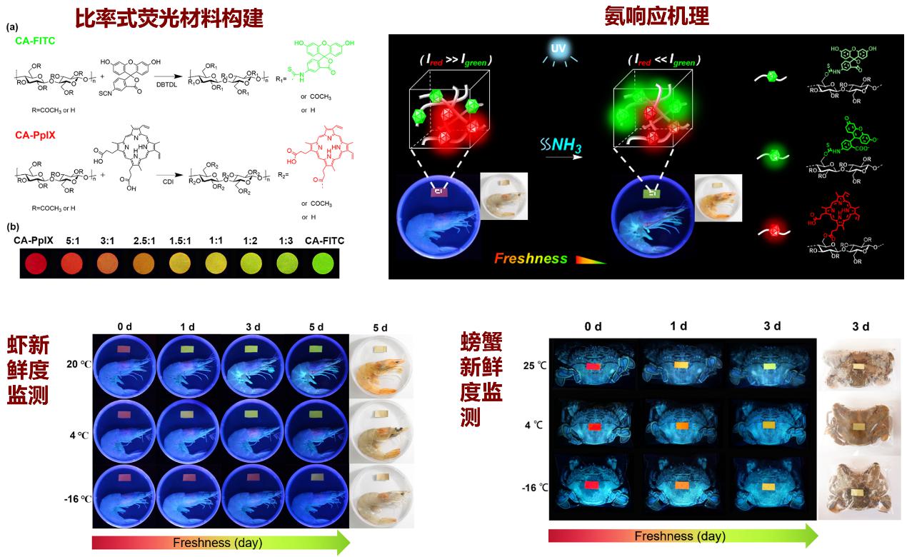 圖6 纖維素基胺響應(yīng)雙發(fā)射固態(tài)熒光標(biāo)簽:海鮮新鮮度監(jiān)測