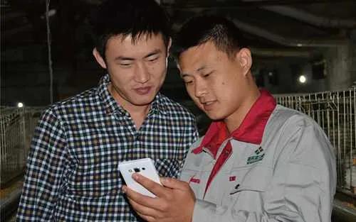 兩名養(yǎng)殖戶正在手機(jī)上操作新希望集團(tuán)推出應(yīng)用軟件(受訪者供圖)