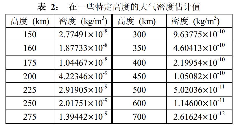 通過查閱相關(guān)參數(shù)數(shù)據(jù)得到衛(wèi)星質(zhì)量m=13200kg, 并假設(shè)衛(wèi)星受阻面積為16m2, 對地軌道速度為7800 m/s, 即Ma= 22.9. 從表 1中我們可以得到相應(yīng)的CD=0.11283. 從ρ(h)函數(shù)關(guān)系可以解出如下表所示的在一些特定高度的大氣密度估計值.