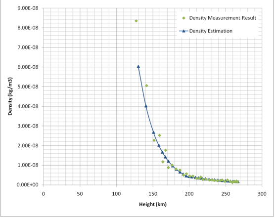 這種模式是否具有實用意義主要取決于離子在工作環(huán)境中是否充足, 即是說, 我們首先必須先測出高層大氣的近似的密度. 又因為它太小, 無法直接測量, 我就想出一種間接的方法: 通過測量不受控制的近地軌道衛(wèi)星的軌道高度的自然衰減. 由于密度可由作用于衛(wèi)星上的大氣阻力大小求出, 這個阻力間接地體現(xiàn)在衛(wèi)星高度衰減上, 因此通過計算我們得出密度ρ (kg/m3 ):