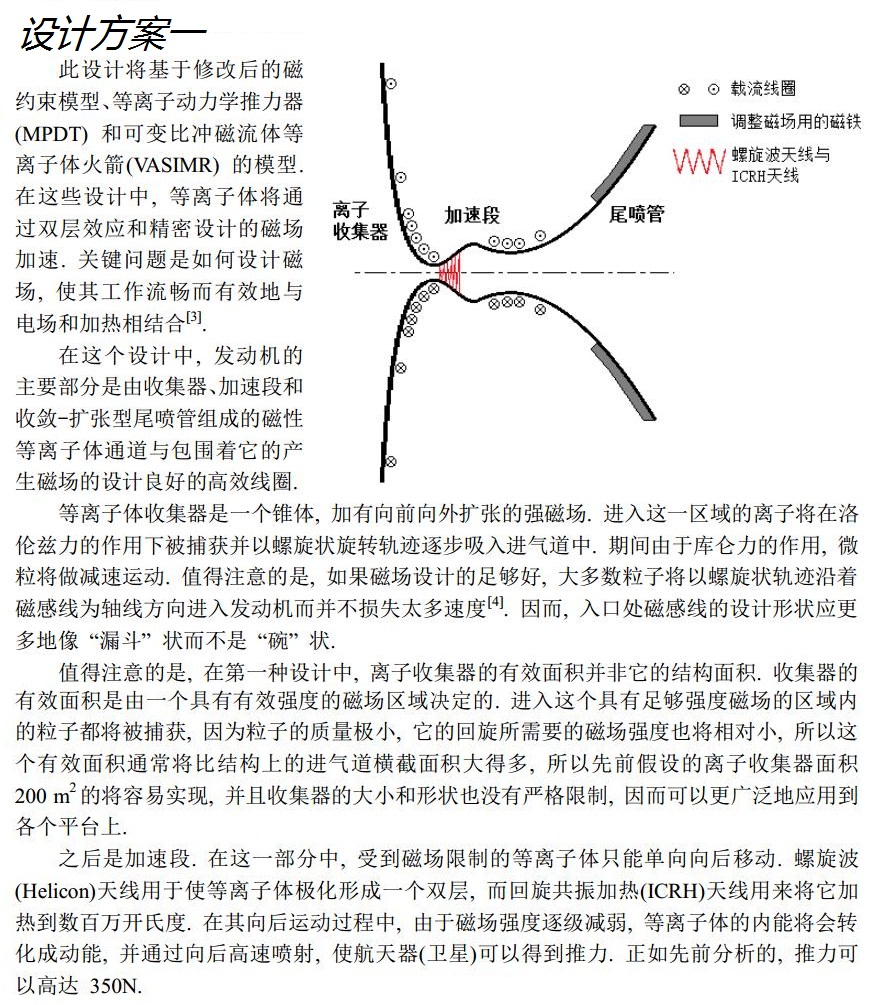 這一事實讓我想起了使用的離子推進器的衛(wèi)星, 如SMART和DAWN衛(wèi)星等. 離子推進器的廣泛應(yīng)用說明了人類在短距離小空間內(nèi)加速離子的技術(shù)日臻成熟. 這也同時讓我考慮到一個新的模型——融合傳統(tǒng)離子推進器和沖壓發(fā)動機的設(shè)計, 讓等離子體代替空氣進入進氣道, 然后使用電場和磁場來加速, 以取代化學(xué)燃料的燃燒. 這就是我的想法的概述.