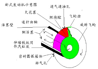 如圖所示:做功之初,提起活塞,首先將伸縮鐵板插進密封圓弧箱體內(nèi)用作汽缸底,飛輪齒用作汽缸頂,進油進氣后,推進活塞,壓迫油氣做功,飛輪旋轉(zhuǎn)帶動車體運動。最后排出廢氣復(fù)位,重復(fù)做功。