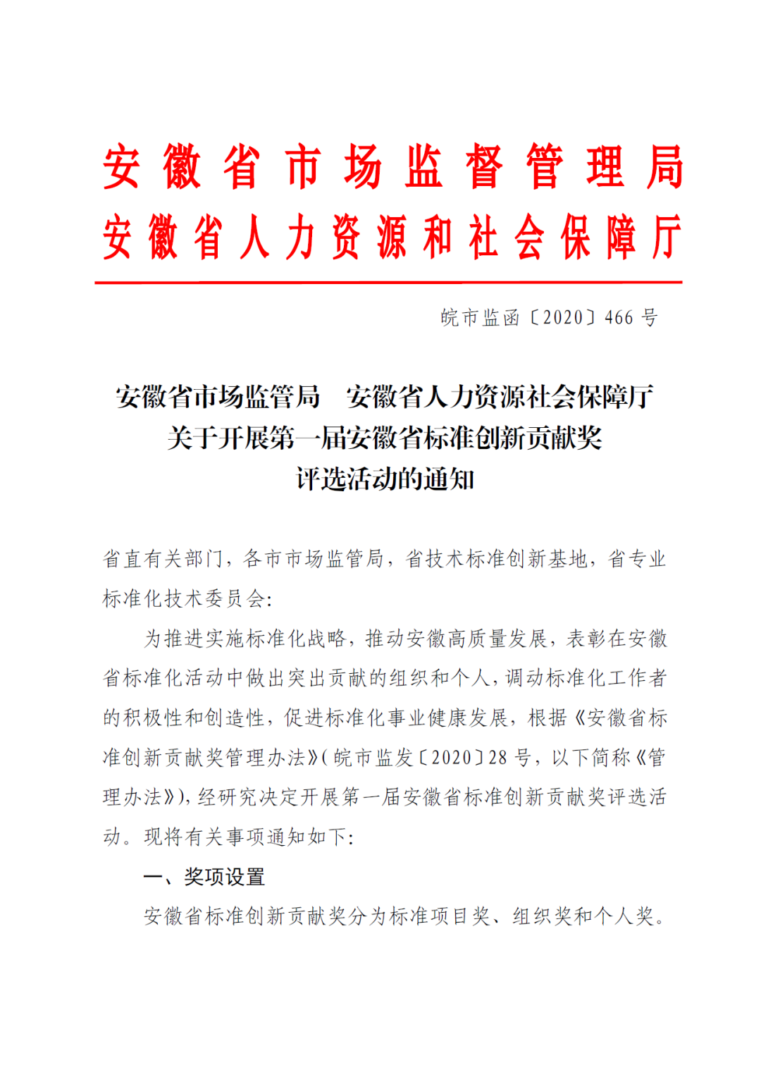 關(guān)于開展第一屆安徽省標(biāo)準(zhǔn)創(chuàng)新貢獻(xiàn)獎(jiǎng)評(píng)選活動(dòng)的通知